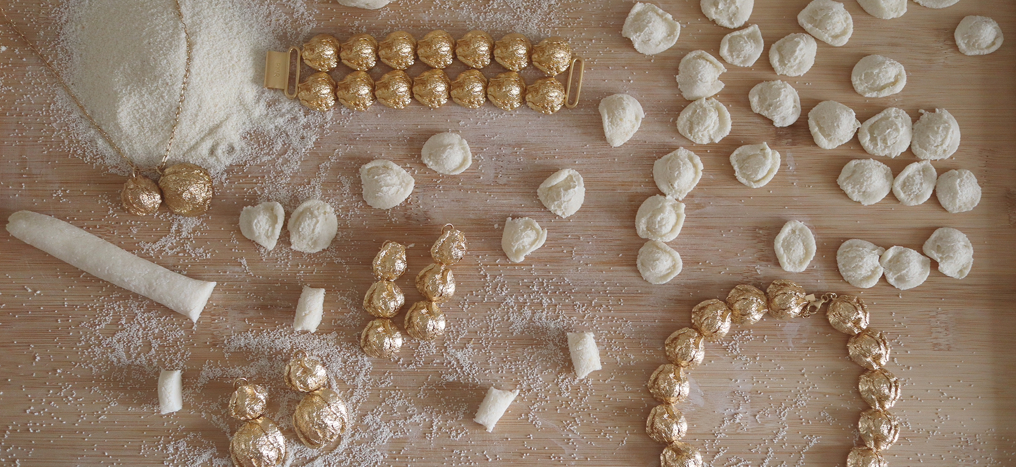 Together with Âme Studio, this collaboration is a collection of jewellery reflecting the deep love between this mother-daughter duo making orecchiette. Sun-dried orecchiette made by hand that Melody brought back from Puglia, were preserved into moulds by our Bali artisans to use for the casting process. Lovingly designed as modern heirlooms to grace the ears, neck and wrist. All of the jewellery in Amanti is made of 18k gold plated recycled bronze.